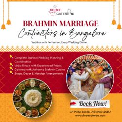 Shree Caterers is one of the most reputable Brahmin Marriage Contractors in Bangalore, ensuring perfect execution of authentic traditions. We provide end-to-end arrangements including catering, decor, rituals and event planning according to your customs. Our experienced team specializes in delivering high-quality vegetarian menus prepared with the utmost purity and care. Shree Caterers manages every detail professionally, making your special day memorable and stress-free. We combine cultural traditions with modern event solutions to make weddings effortless. Contact Shree Caterers today to book reliable Brahmin marriage contractors in Bangalore for your upcoming celebrations.