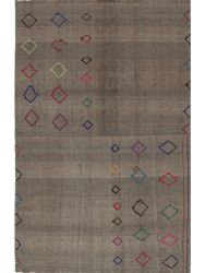 Transform your home with this exquisite 5x8 taupe Persian Kilim rug, featuring a striking geometric pattern. Handwoven from high-quality wool, this flatweave rug combines artistic craftsmanship with practicality. The blend of taupe, gray, brown, and purple creates a refined aesthetic suitable for classic interiors alike. Whether placed in a living room, dining space, or home office, this Persian Kilim rug is sure to be a stylish and durable accent to your decor.