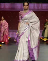 A silver Kanjivaram saree at Adhvaria Silks might be envisioned as a lustrous silk drape in delicate silver tones, enriched with shimmering zari‑motifs and contrasting temple or floral borders. An elegant, timeless piece ideal for weddings and festive occasions.