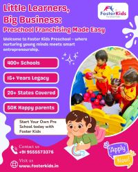 At FosterKids, we are dedicated to providing world-class early childhood education and nurturing the leaders of tomorrow. As one of the fastest-growing preschool franchises in India, we operate in over 100 cities, including a strong presence in Delhi NCR and major metro- politan areas. Founded by the experienced Foster Group of Schools, FosterKids blends innovative teaching methods with a child-friendly curriculum tailored specifically for Indian children. Our franchise model offers aspiring entrepreneurs and educators an excellent opportunity to start and run successful play schools with complete support. Foster Kids is proud to offer one of the best preschool franchise opportunities in India, combining low investment, zero royalty, and end-to-end support. Whether you’re an entrepreneur, educator, or dreamer, our preschool franchise model empowers you to start your own successful play school business with confidence. Foster Kids offers India’s most affordable preschool franchise without compromising quality. Open your own play school franchise in India with our trusted brand name and curriculum. We make it simple to launch a preschool in India with 360-degree support and no royalty fees. Preschool education in India is evolving, and Foster Kids is leading the transformation. Our early childhood education system is tailored for Indian culture, values, and families. Running a preschool business in India is both profitable and emotionally fulfilling. With Foster Kids, you can start a preschool anywhere in India — urban or semi-urban. Join a mission-driven franchise that goes beyond business — one that changes lives every single day. As a foster Kids franchise partner, you'll provide essential support to children in need, while building a rewarding and impactful career. If you've ever dreamed of owning a business that gives back, now is your chance. Together, we can give every child the safe, loving environment they deserve. Message us to learn more or visit website https://fosterkids.in to start your journey. Call Us Now + 91 – 95555 73376