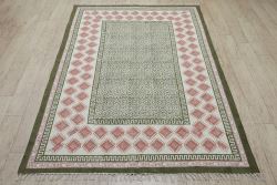 Handmade washable cotton dhurrie rug by MKMHomesCraft. Perfect for entryway, kitchen, or home decor. Features green block print design, durable runner style, and customizable square sizes for modern and traditional interiors.