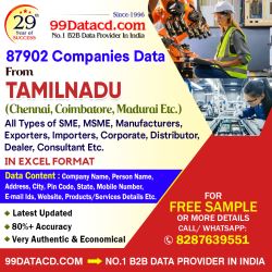 Want to buy list of companies in Chennai? Buy list of 87902 TAMILNADU (Chennai, Coimbatore, Madurai Etc.) B2B Companies Data - In Excel format. The list of companies in Chennai includes all types of SME, MSME, Manufacturers, Exporters, Importers, Corporates, Distributors, Dealers, Consultants etc. Our data includes company name, address, mobile number, email ID and business details, etc. Access expert-curated data in Excel format—only a click away! Pay securely and download instantly from our website. Super Saving offer with a 30% discount today! Hurry! Grab this deal before it’s gone!
