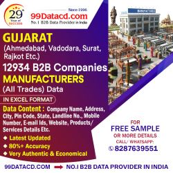 Are you looking for top Ahemdanad manufacturing companies list? 99Datacd is the best platform for you. 99Datacd is a B2B database provider company based in Delhi. Buy 12934 Gujarat (Ahmedabad, Vadodara, Surat, Rajkot Etc.) Manufacturers (All Trades such as Multi National Companies, Co-Operates Companies, LTD/PVT LTD/LLP Companies, Micro, Small & Medium Business Houses, Many More) Data - In Excel Format. Our valuable data includes company names, addresses, contact numbers, email IDs, websites, and product/service details. Our comprehensive list of Ahemdanad manufacturing companies helps to boost your business and connect to the right vendors. For more details visit our website and follow some simple steps to buy and download the exclusive list of Ahemdanad manufacturing companies. Get 30% discount on purchase of data For a free sample/more details, call our experts Call/Whatsapp: 8287639551 Email ID: sales@99datacd.com Address: 206, RG Trade Tower, Netaji Subhash Place, Delhi - 11