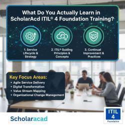 The ITIL® 4 Foundation certification is widely considered the gold standard for anyone entering or advancing in the field of IT Service Management (ITSM). But what does that really mean? What specific knowledge and skills do you gain from this training, and how does ScholarAcad course make that learning truly effective? This article will break down the core components of ScholarAcad ITIL® 4 Foundation training, showing you exactly what you'll learn and why it’s a vital step for your career. We don't just help you pass the exam; we give you the tools to become a more strategic and valuable IT professional. The ITIL® 4 Framework: A Modern Mindset for IT A fundamental change in perspective is the most important lesson learnt from ITIL® 4 Foundation training. You learn to adopt a contemporary, comprehensive approach where IT services are planned, implemented, and managed to add value for the company and its clients, rather than sticking to the old, compartmentalised view of IT as a technical support function. You will discover the specific foundations upon which this new viewpoint is based. The Service Value System (SVS): A Blueprint for Success The ITIL® 4 Service Value System (SVS) is the central component of the framework. It's an end-to-end operating model that shows how an organization's various components and activities work together to create value. In ScholarAcad training, you’ll learn the five key components of the SVS: 1. Guiding Principles: The principles you learned earlier. 2. Governance: The framework that directs and controls the organization's activities. 3. Service Value Chain (SVC): The flexible operational model for creating, delivering, and improving services. You'll learn the six activities of the SVC: Plan, Improve, Engage, Design & Transition, Obtain/Build, and Deliver & Support. 4. Practices: The resources and capabilities needed to perform work. 5. Continual Improvement: The ongoing effort to improve services and practices. The ScholarAcad Difference: Why Our Training Stands Out With so many training providers on the market, why choose ScholarAcad? Our IT Service Management Training is meticulously designed to provide a superior learning experience that goes beyond the basics. • Expert-Led Instruction: Our trainers are not just teachers; they are certified ITIL® practitioners with extensive, hands-on experience. They bring the material to life with real-world examples and case studies that help you understand not just the "what," but the "how" and the "why" of ITIL®. This ensures that the knowledge sticks and that you can apply it effectively in your job. • Comprehensive Exam Preparation: Our course is built for success. We provide a full suite of exam preparation tools, including mock exams that simulate the real test environment and a comprehensive question bank. This rigorous preparation builds your confidence and significantly increases your chances of passing the exam on your first attempt. • Focus on Practical Application: We believe that the true value of a certification is in its practical application. Our curriculum is designed with this in mind, with exercises and discussions that challenge you to think critically and apply ITIL® principles to real-world scenarios. Selecting ScholarAcad will enable you to gain a thorough, hands-on understanding of contemporary IT service management, which will enable you to flourish in your current position and pave the way for future career opportunities. You'll gain knowledge of the ITIL® language, comprehend its strategic importance, and be prepared to lead constructive change within your company.