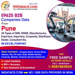Are you looking for a Pune company list? 99Datacd offers top Pune company list at affordable prices. Our database is a effective lead generation tool for marketing individuals. Buy 59,625 PUNE B2B Companies (all types of SMEs, MSMEs, FMCG, manufacturers, corporations, exporters, importers, distributors, and dealers) data in excel format. Our up-to-date data includes Company Name, Address, City, Pin Code, State, Landline No., Mobile Number, E-mail Ids, Website, Products/Services Details.