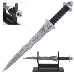 Features: This dagger is an replica of the letter opener carried by the one and only Rumplestiltskin in the series. Every detail, from the blade to the pommel, captures the essence of its magic and personality. Made with a metal blade, guard and knob, along with a plastic handle, this dagger fuses quality and aesthetics. A collector's item that reflects exceptional craftsmanship. More than just a letter opener, this piece deserves a place of honor. The wooden table stand adds a touch of class, making it a high-end decorative element. Specifications: Overall Length: 16.5 Inches Handle Length: 4 Inches Blade Length: 10.75 Inches