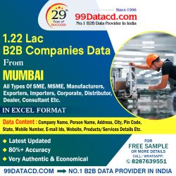 Are you looking for Mumbai manufacturing companies list? 99Datacd is a renowned B2B database provider company in India. Our Mumbai manufacturing companies list helps businessesto grow efficiently.Buy 1.22 Lac MUMBAI B2B Companies Data - In Excel Format. The up-to-date data includes company name, address, city, pin code, state, landline No., mobile number, E-mail Ids, website, products/services details. Our experts also provide a Mumbai companies list at affordable prices.