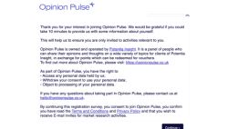 Opinion Pulse is owned and operated by Potentia Insight. It is a panel of people who can share their opinions and thoughts on a wide variety of topics for clients of Potentia Insight, in exchange for points which can be redeemed for vouchers.