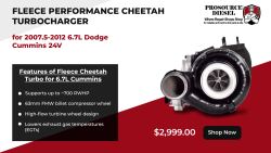 The Fleece Cheetah Turbocharger stands as a durable solution for 2007.5-2012 6.7L Dodge Cummins engines, engineered with a 63mm FMW compressor wheel and Inconel turbine wheel. This design ensures smooth throttle response, high top-end power, and reliability under demanding conditions, supporting up to 700 RWHP without compromising performance.