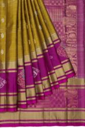 Explore Mavuri’s parrot green silk saree with pink border. Luxurious silk fabric, rich pink edging, and impeccable craftsmanship for an elegant ethnic statement.