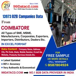 Get the Coimbatore Companies List from 99Datacd, a leading B2B database provider company in India. Buy 13,793 COIMBATORE B2B Companies Data - In Excel Format (All Types Of SME, MSME, Manufacturers, Exporters, Importers, Corporate, Distributor, Dealer, Consultants etc.). Our comprehensive data helps you to grow your business efficiently. Our expert team offers customized business data solutions that include essential details such as Company Name, Contact Person, Address, City, Pin Code, State, Mobile Number, E-mail ID, and Website Details. Get 30% off on every data purchase. Grab this offer today. For a free sample/more details, call our experts Call/ Whatsapp: 8587804924, 8287639551 Email ID: sales@99datacd.com Address: 206, RG Trade Tower, Netaji Subhash Place, Delhi - 110034, India