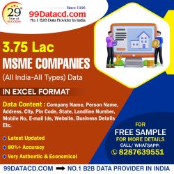 Are you looking for top MSME list of companies? Look no further! Visit 99Datacd, a leading B2B Database provider in India. Our top quality database helps you to build connection with new vendors and distributors.  Buy 3.75 Lac MSME Companies (All India - All Types) Data. The data includes details such as Company Name, Person Name, Address, City, Pin Code, State, Landline Number, Mobile No, E-mail Ids, Website, Business Details . Get 30% off on every data purchase. Grab this offer today.