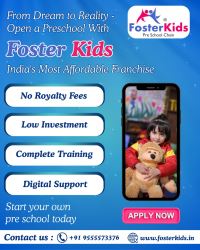 At FosterKids, we are dedicated to providing world-class early childhood education and nurturing the leaders of tomorrow. As one of the fastest-growing preschool franchises in India, we operate in over 100 cities, including a strong presence in Delhi NCR and major metro- politan areas. Founded by the experienced Foster Group of Schools, FosterKids blends innovative teaching methods with a child-friendly curriculum tailored specifically for Indian children. Our franchise model offers aspiring entrepreneurs and educators an excellent opportunity to start and run successful play schools with complete support. Foster Kids is proud to offer one of the best preschool franchise opportunities in India, combining low investment, zero royalty, and end-to-end support. Whether you’re an entrepreneur, educator, or dreamer, our preschool franchise model empowers you to start your own successful play school business with confidence. Foster Kids offers India’s most affordable preschool franchise without compromising quality. Open your own play school franchise in India with our trusted brand name and curriculum. We make it simple to launch a preschool in India with 360-degree support and no royalty fees. Preschool education in India is evolving, and Foster Kids is leading the transformation. Our early childhood education system is tailored for Indian culture, values, and families. Running a preschool business in India is both profitable and emotionally fulfilling. With Foster Kids, you can start a preschool anywhere in India — urban or semi-urban. Join a mission-driven franchise that goes beyond business — one that changes lives every single day. As a foster Kids franchise partner, you'll provide essential support to children in need, while building a rewarding and impactful career. Why Choose Our Franchise? ✔️ Proven business model with full training & support ✔️ Meaningful work with real community impact ✔️ Opportunity to empower children and families ✔️ Be part of a purpose-driven network If you've ever dreamed of owning a business that gives back, now is your chance. Together, we can give every child the safe, loving environment they deserve. Message us to learn more or visit website https://fosterkids.in to start your journey. Call Us Now + 91 – 95555 73376